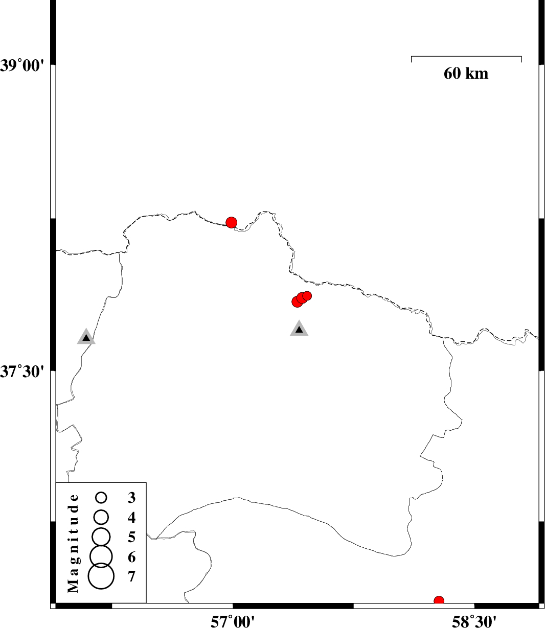 | 2012/12/23 | 19:06:02.0 | 22:36:02.0 | 37.86 | 57.43 | 6 | ML:3.1 | Khorasan(north) Province, 44 km North-East of Bojnurd | ||