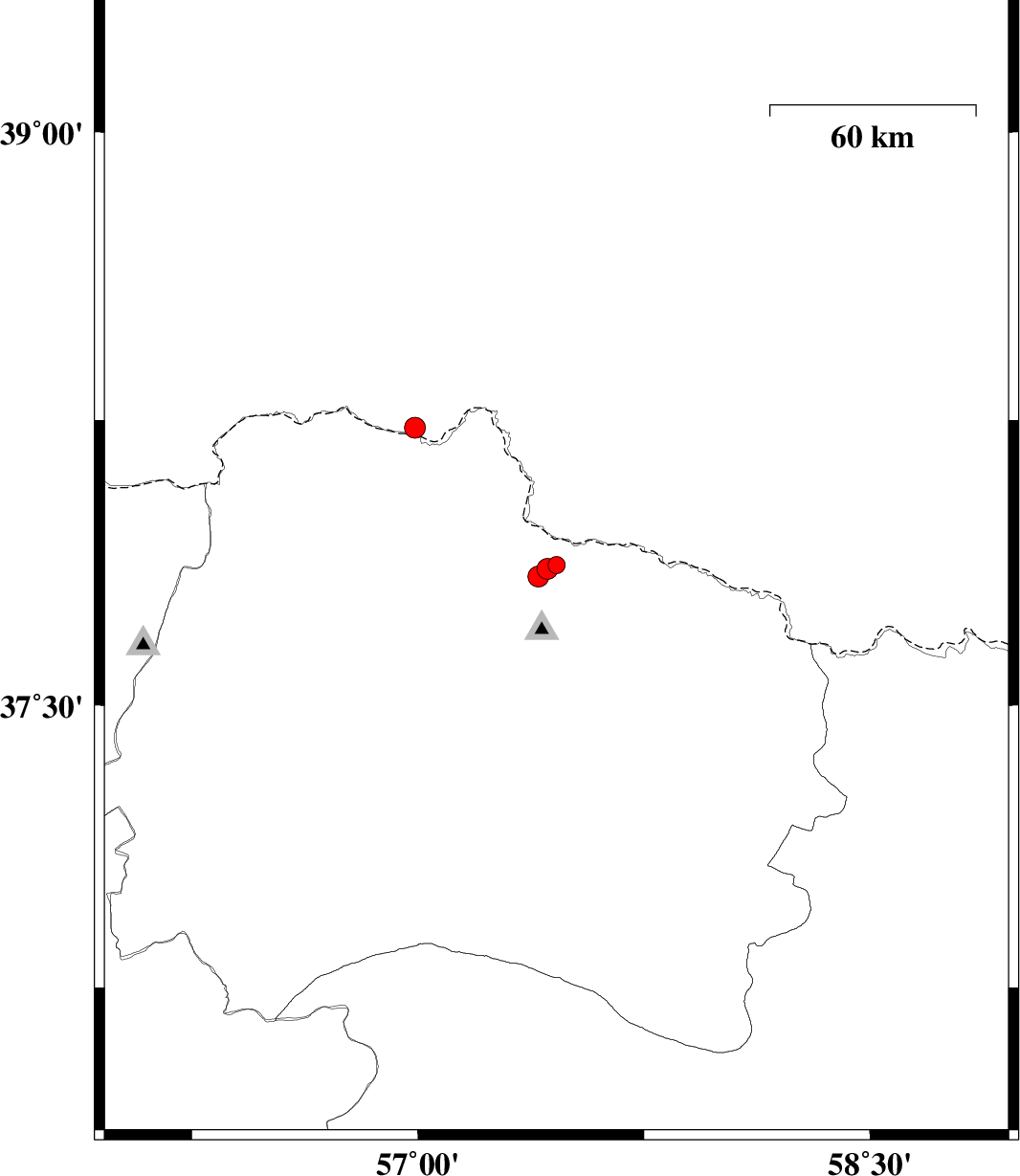 | 2012/12/23 | 21:24:16.1 | 00:54:16.1 | 37.87 | 57.46 | 6 | ML:2.6 | Khorasan(north) Province, 45 km North-East of Bojnurd | ||