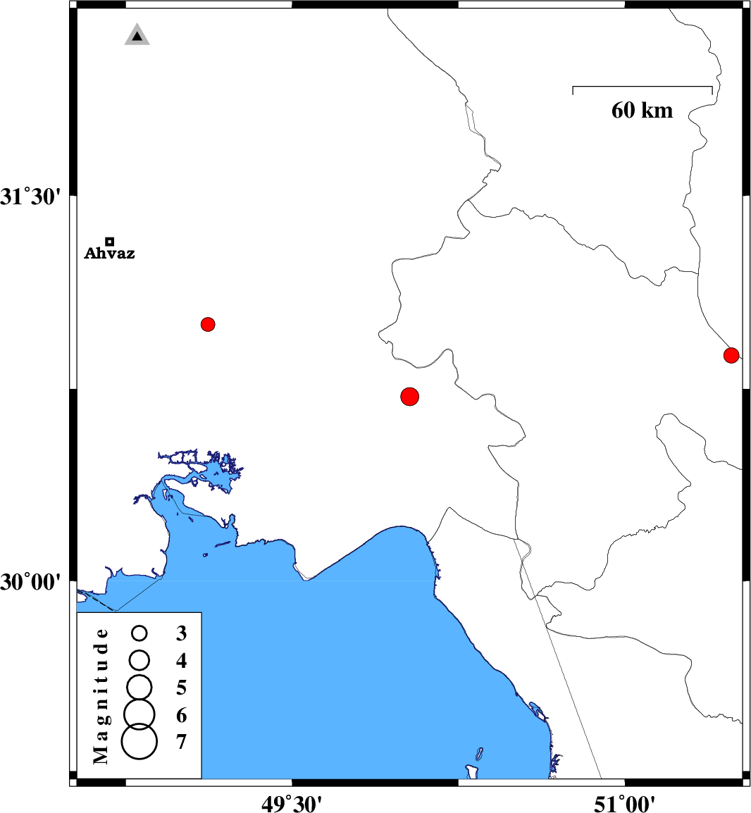 | 2012/12/26 | 01:26:42.8 | 04:56:42.8 | 30.72 | 50.03 | 38 | ML:3.7 | Khoozestan Province, 25 km North-West of Behbahan | ||