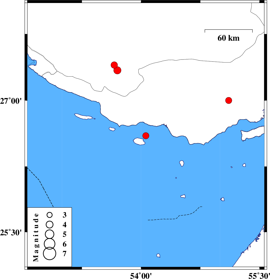 | 2012/12/26 | 03:52:54.0 | 07:22:54.0 | 26.6 | 54.06 | 15 | ML:3.7 | Persian Gulf, 78 km West of Bandar-e lengeh | ||