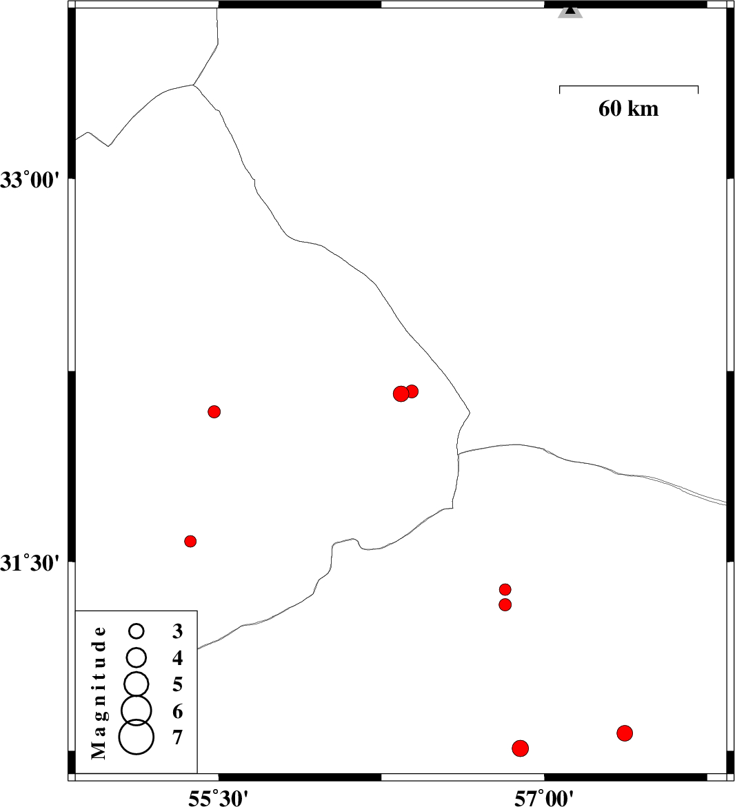 | 2012/12/05 | 07:43:12.9 | 11:13:12.9 | 31.39 | 56.82 | 14 | ML:2.4 | Kerman Province, 14 km North of Ravar | ||