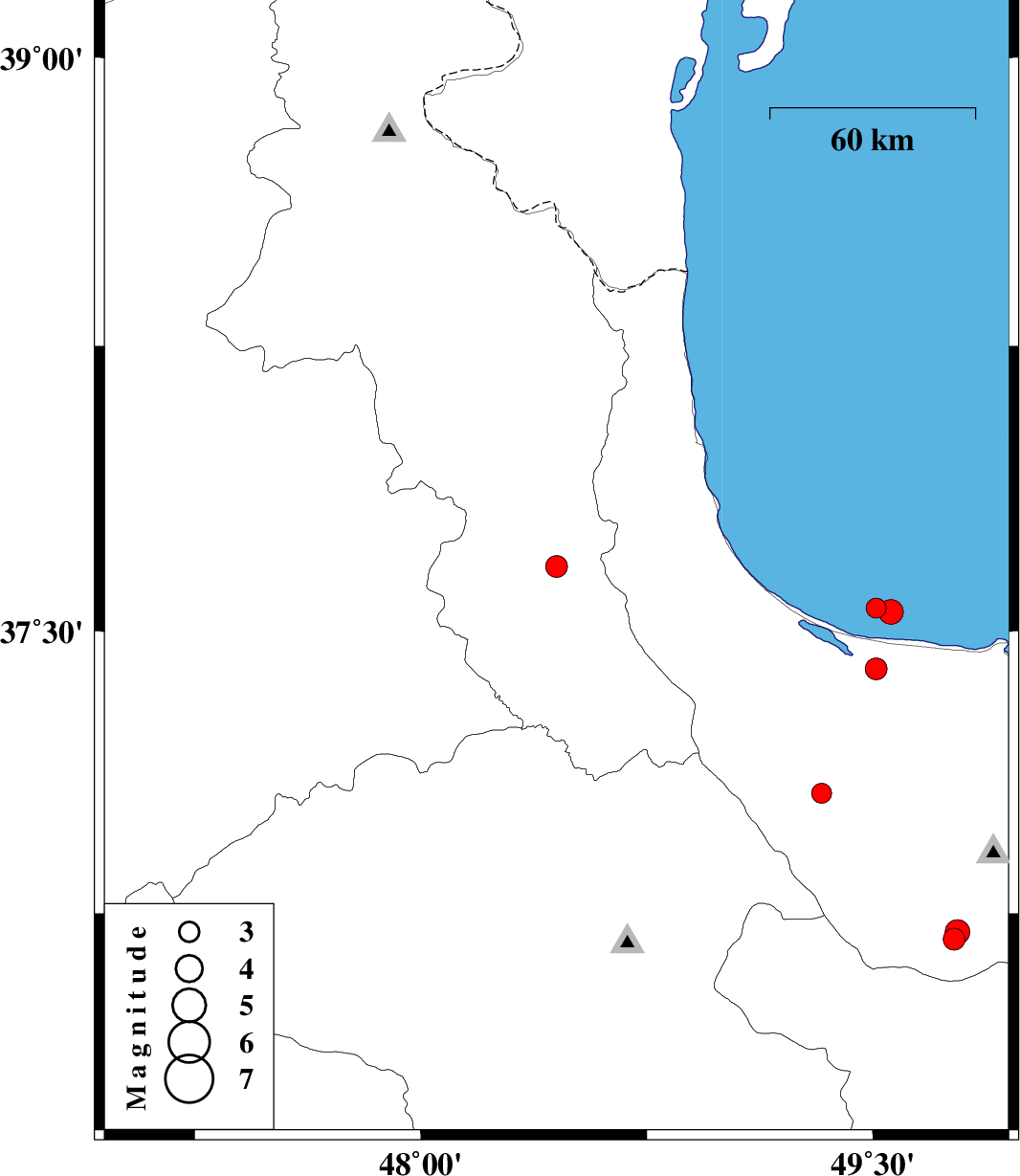 | 2012/12/11 | 09:47:18.7 | 13:17:18.7 | 37.56 | 49.51 | 14 | ML:2.9 | Caspian Sea, 11 km Bandar-e anzali | ||