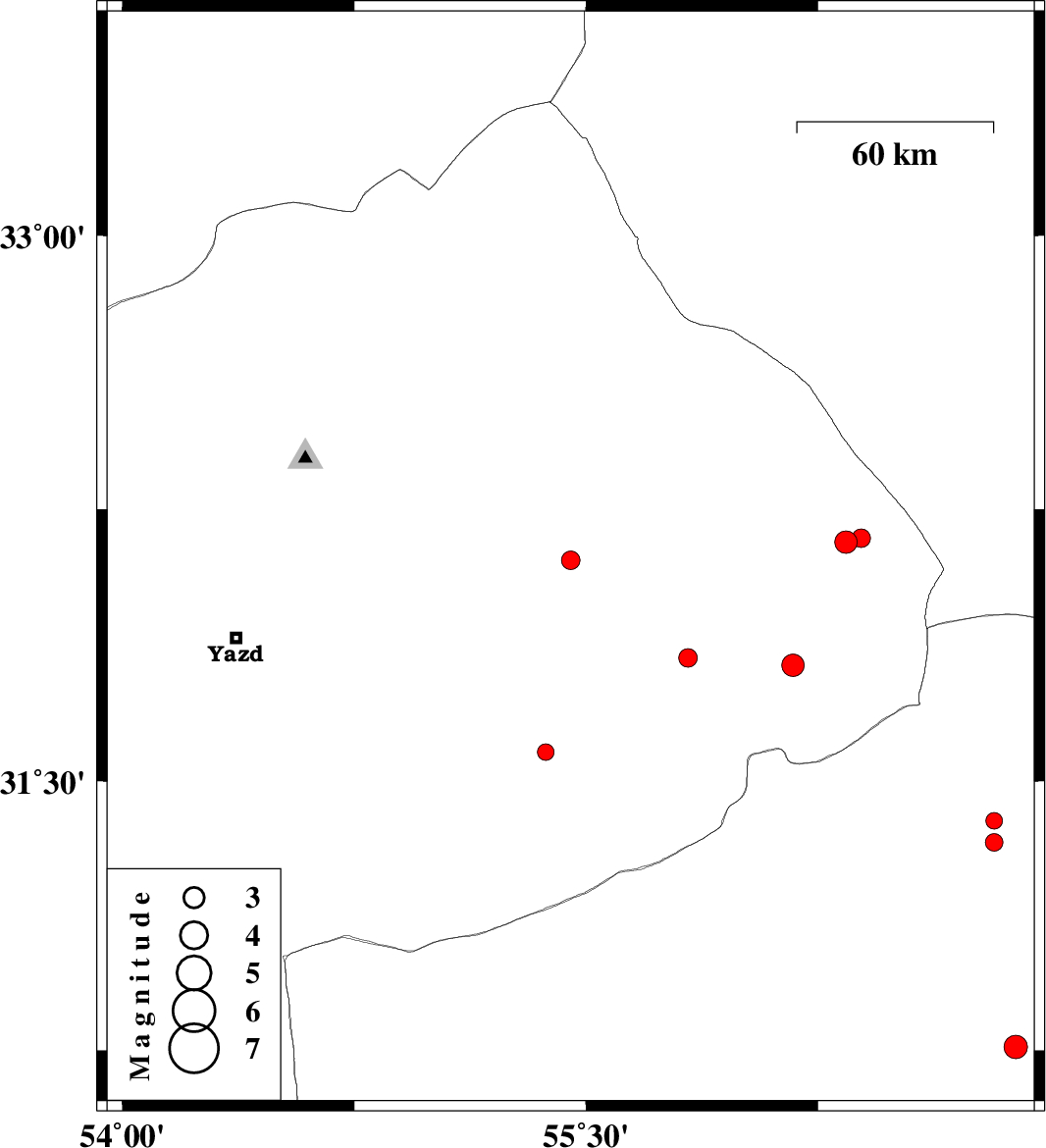 | 2012/12/05 | 07:43:12.9 | 11:13:12.9 | 31.39 | 56.82 | 14 | ML:2.4 | Kerman Province, 14 km North of Ravar |