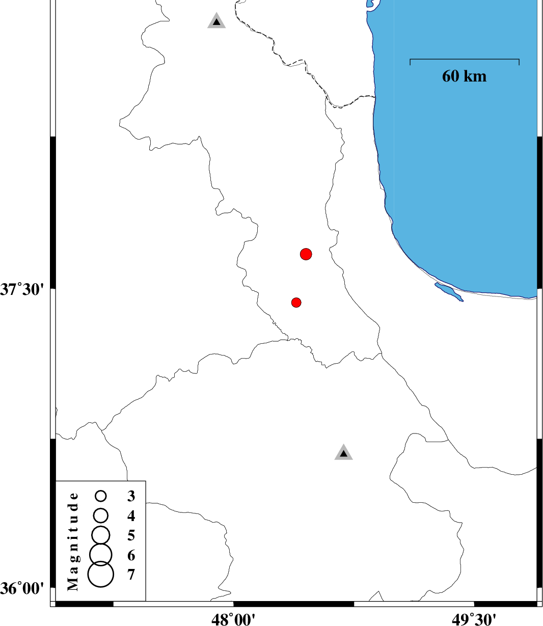 | 2013/01/03 | 02:26:41.6 | 05:56:41.6 | 37.43 | 48.39 | 14 | ML:2.7 | Ardebil Province, 30 km South of Givi | ||