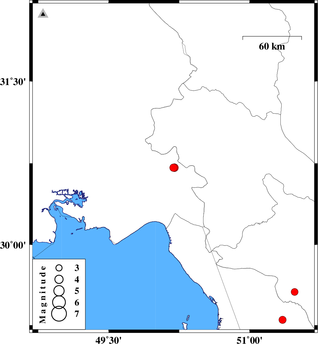 | 2013/01/01 | 08:35:41.1 | 12:05:41.1 | 29.3 | 51.35 | 9 | ML:3.5 | Bushehr Province, 15 km East of Borazjan |