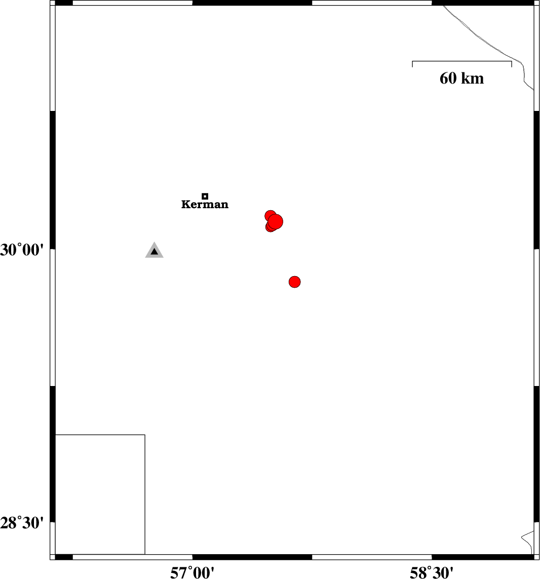 | 2013/01/06 | 15:13:17.3 | 18:43:17.3 | 30.18 | 57.49 | 17 | ML:3.2 | Kerman Province, 41 km South-East of Kerman | ||