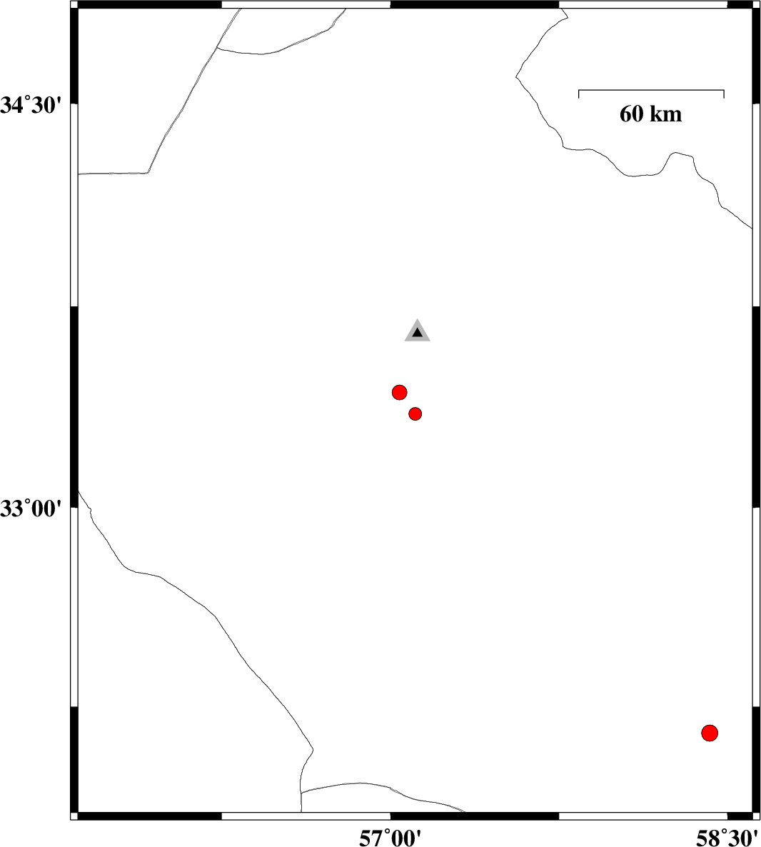 | 2013/01/07 | 12:42:56.1 | 16:12:56.1 | 33.43 | 57.04 | 14 | ML:2.9 | Yazd Province, 22 km South-East of Tabas | ||