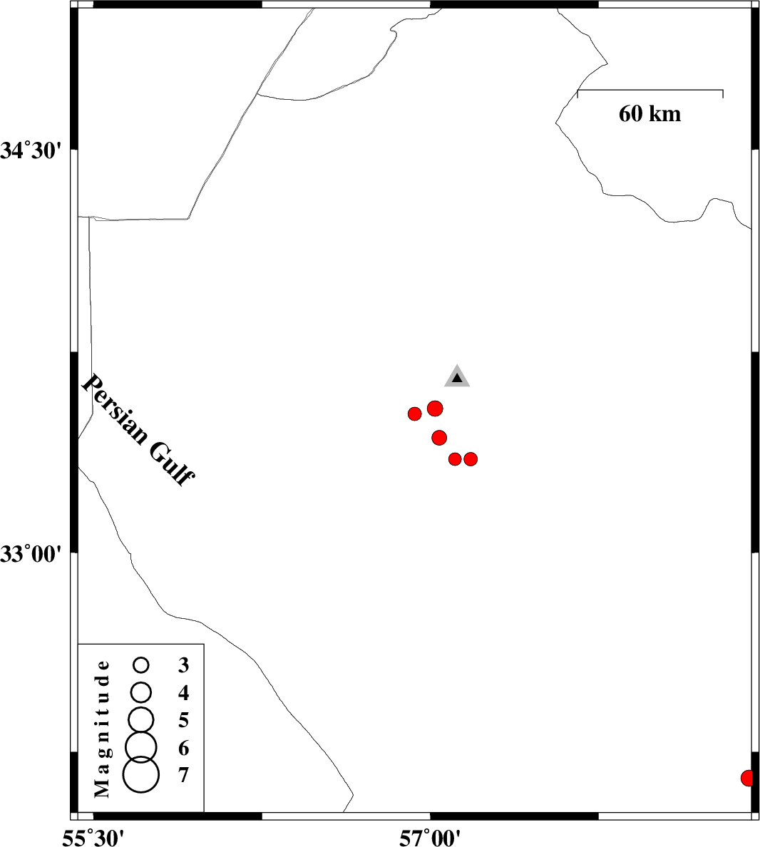 | 2013/01/07 | 12:42:56.1 | 16:12:56.1 | 33.43 | 57.04 | 14 | ML:2.9 | Yazd Province, 22 km South-East of Tabas | ||