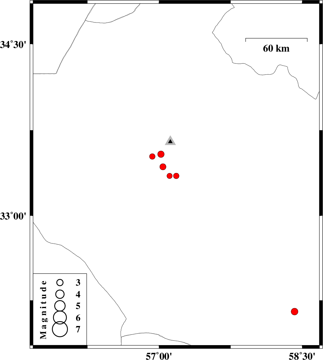 | 2013/01/07 | 12:42:56.1 | 16:12:56.1 | 33.43 | 57.04 | 14 | ML:2.9 | Yazd Province, 22 km South-East of Tabas | ||