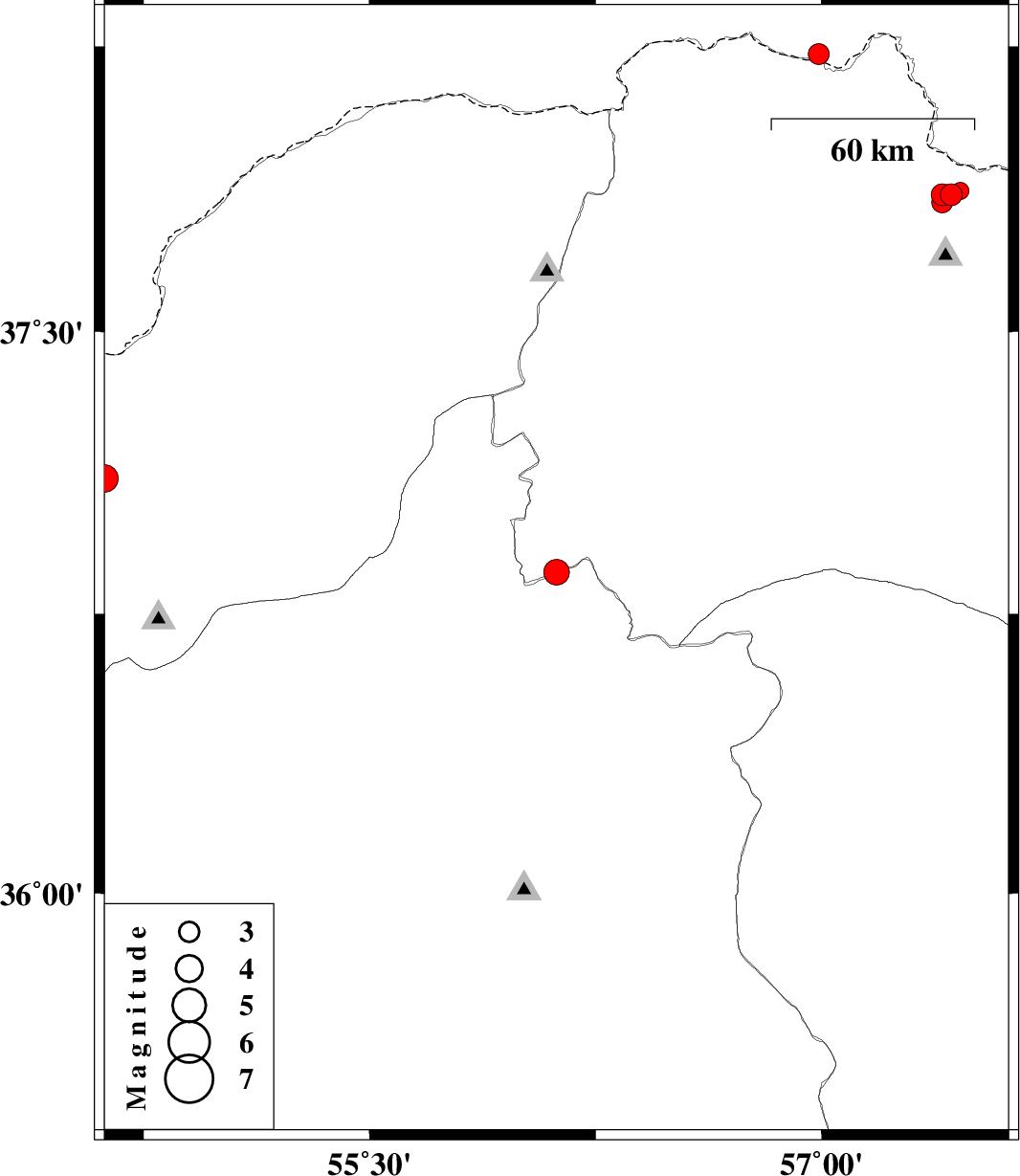 | 2012/12/26 | 17:40:25.3 | 21:10:25.3 | 37.86 | 57.43 | 6 | ML:3.3 | Khorasan(north) Province, 44 km North of Bojnurd | ||