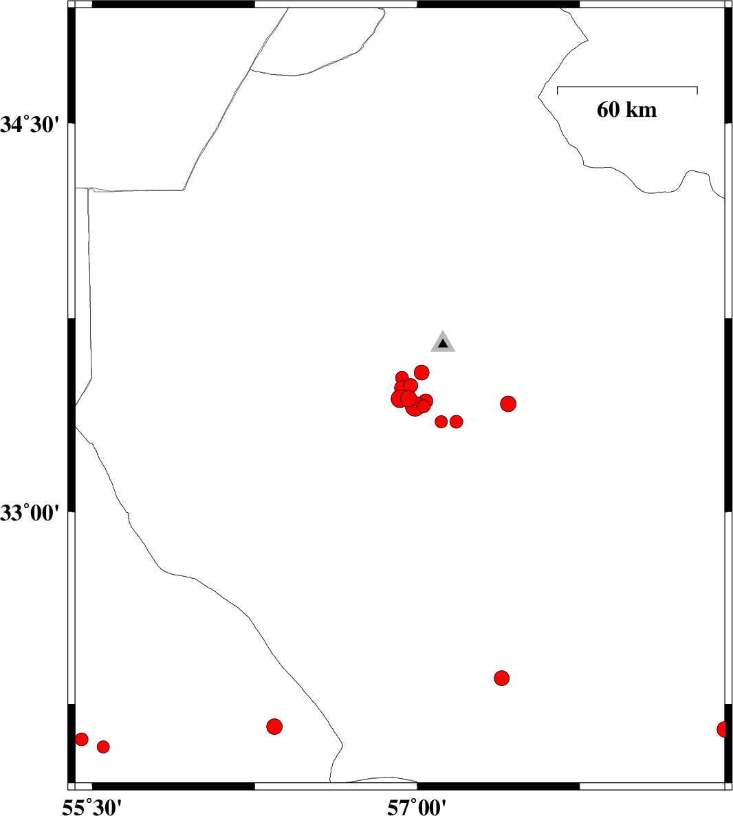 2013/01/09 | 11:05:19.6 | 14:35:19.6 | 33.46 | 56.93 | 14 | ML:3.1 | Yazd Province, 15 km South of Tabas | ||