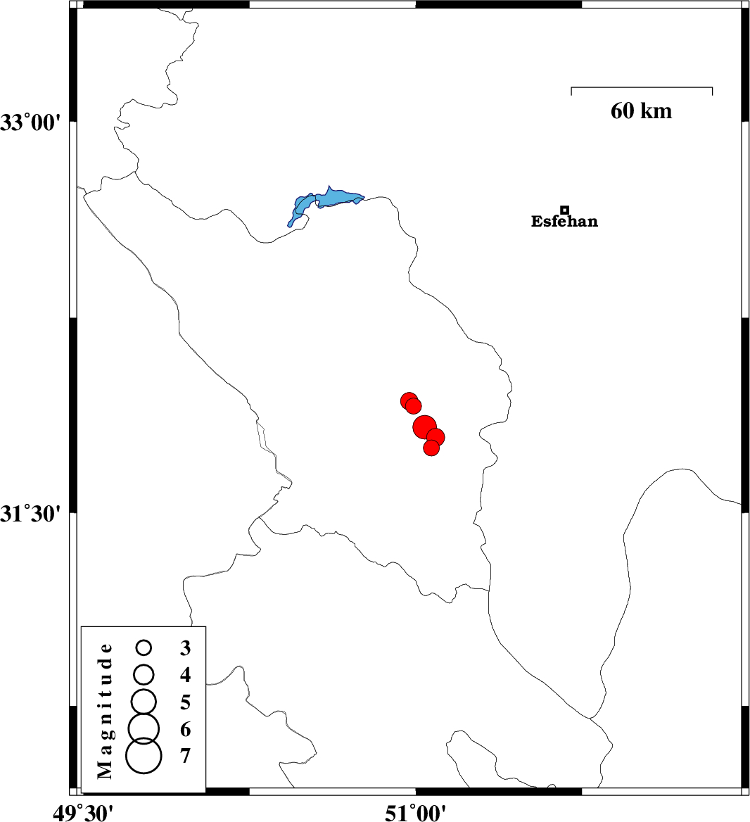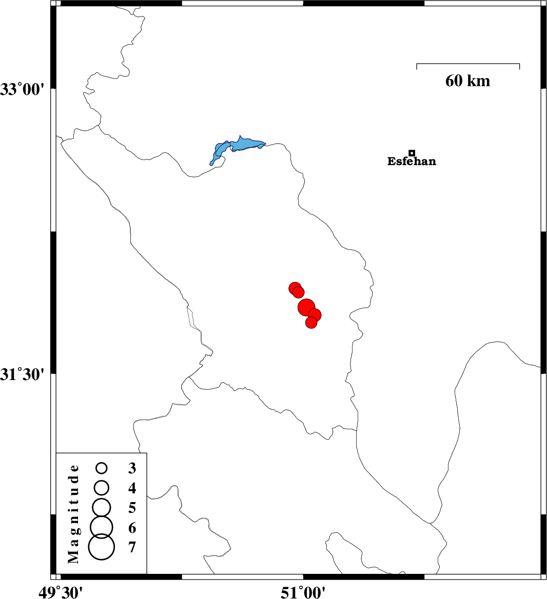 | 2013/01/12 | 03:25:05.8 | 06:55:05.8 | 31.85 | 51.02 | 14 | ML:4.8 | Chaharmahal Bakhtiari Province, 29 km South-West of Borujen |