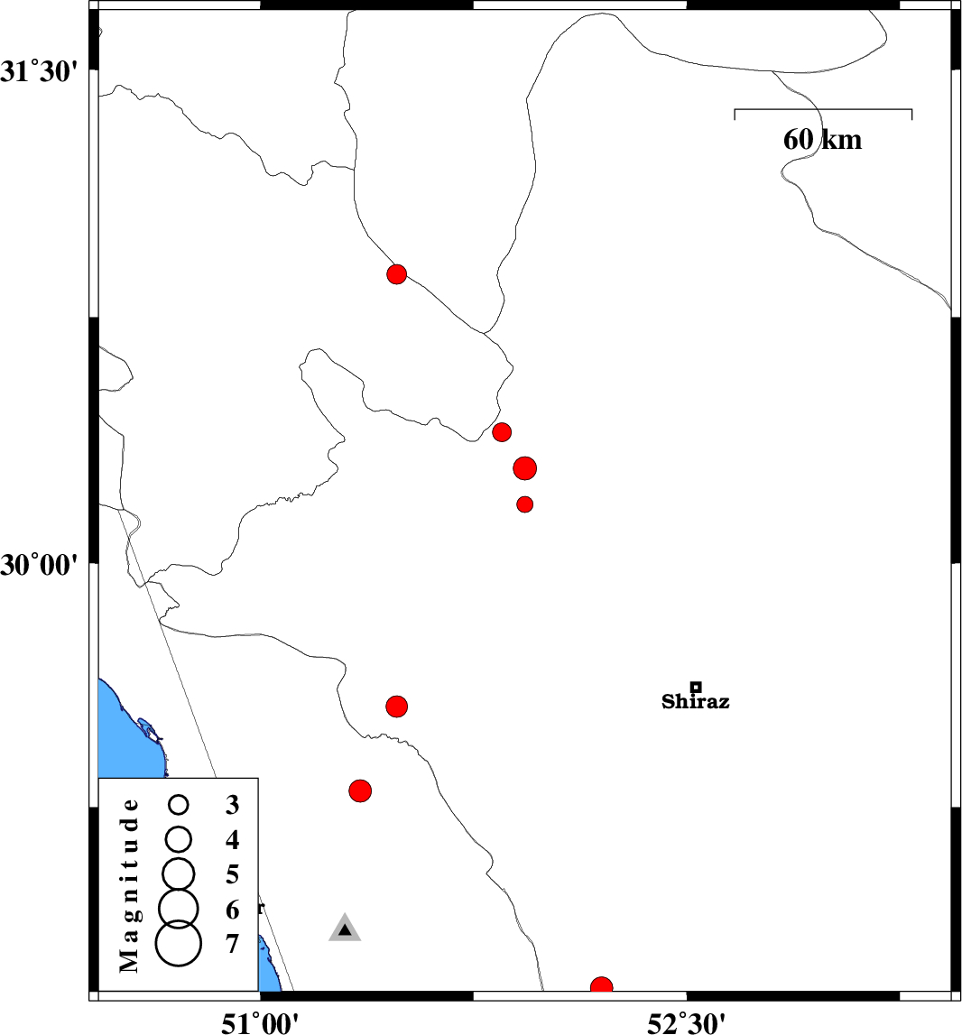 | 2013/01/06 | 13:54:09.8 | 17:24:09.8 | 29.56 | 51.48 | 17 | ML:3.4 | Fars Province, 18 km West of Kazerun | ||