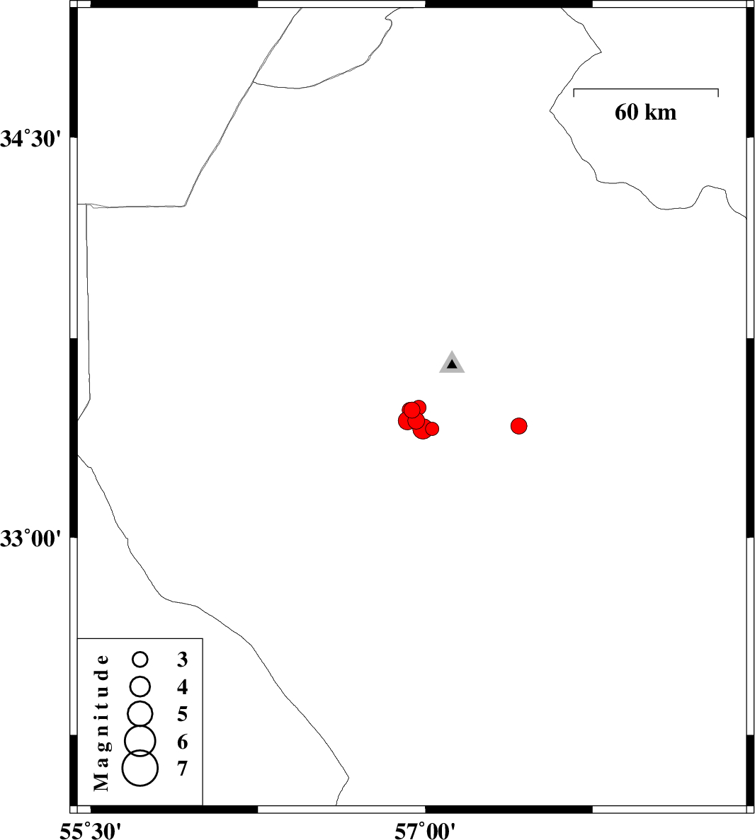 | 2013/01/15 | 18:32:09.1 | 22:02:09.1 | 33.44 | 56.92 | 14 | ML:3.6 | Yazd Province, 18 km South of Tabas | ||