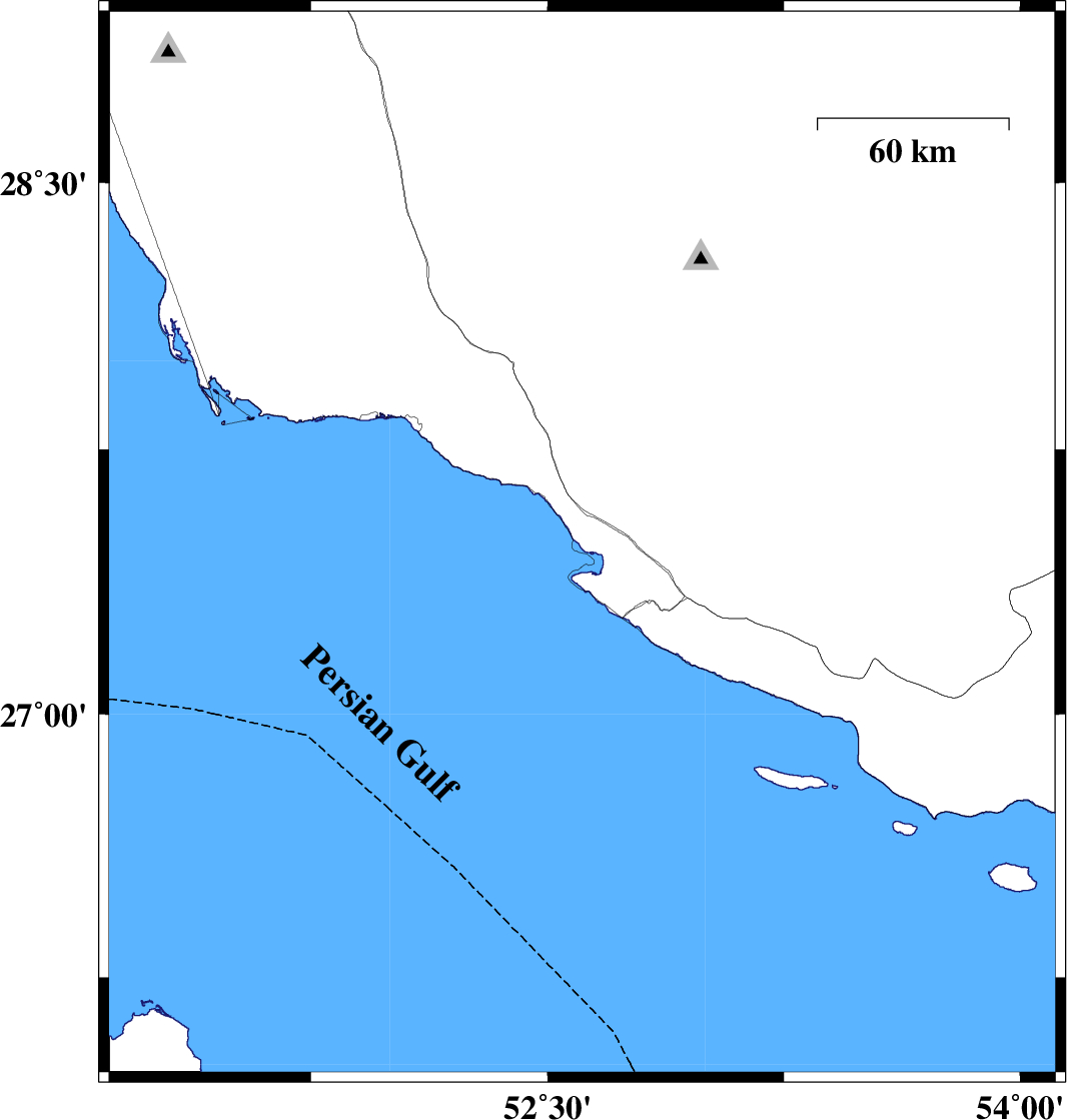 2013/01/22 | 12:25:52.7 | 15:55:52.7 | 27.48 | 52.61 | 14 | ML:3.3 | Bushehr Province, 29 km West of Mehr |