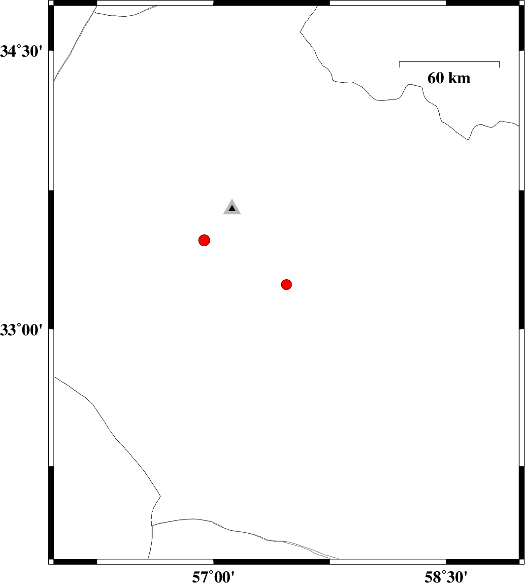 | 2013/01/23 | 17:27:45.8 | 20:57:45.8 | 33.24 | 57.47 | 17 | ML:2.9 | Yazd Province, 65 km South-East of Tabas | ||