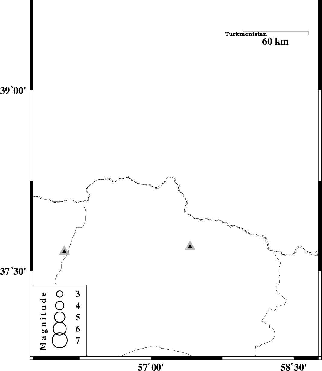 | 2013/01/23 | 17:58:30.4 | 21:28:30.4 | 38.28 | 57.26 | 14 | ML:2.9 | Turkmenistan, 90 km North of Bojnurd |