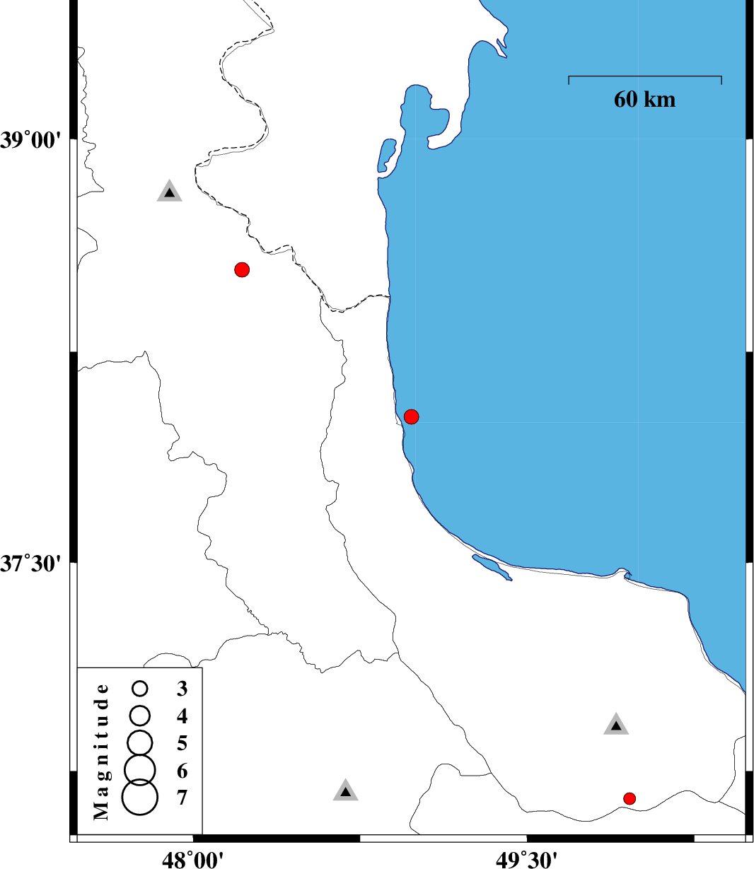 | 2013/01/23 | 20:52:08.8 | 00:22:08.8 | 38.02 | 48.98 | 14 | ML:3 | Caspian Sea, 25 km North of Hashtpar | ||