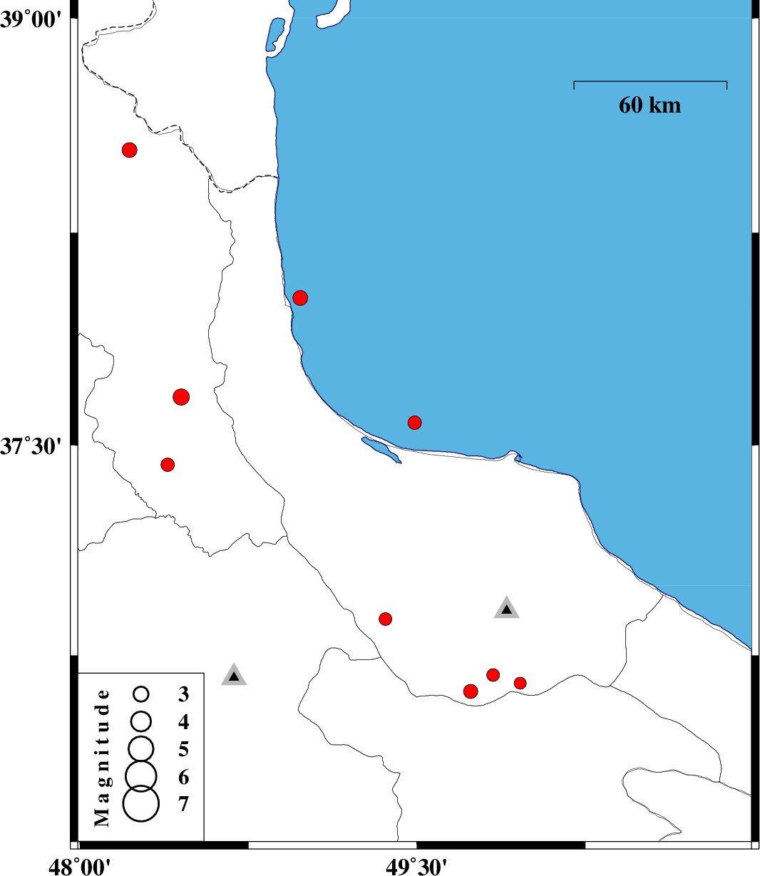 | 2013/01/29 | 10:51:41.7 | 14:21:41.7 | 37.58 | 49.49 | 14 | ML:2.7 | Caspian Sea, 12 km North of Bandar-e anzali | ||