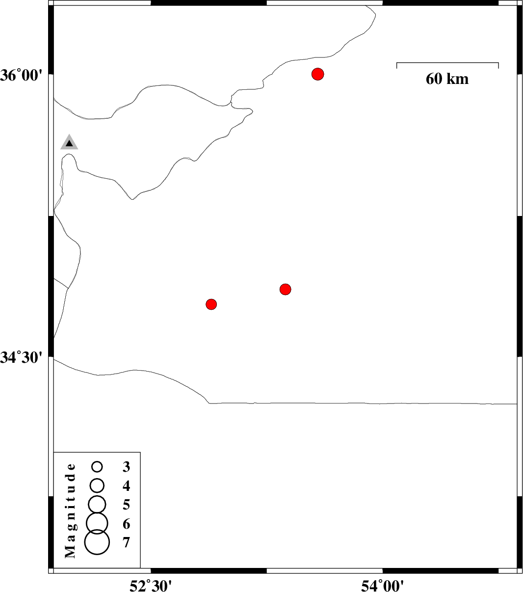 | 2012/12/31 | 18:42:19.7 | 22:12:19.7 | 34.78 | 52.89 | 15 | ML:3.1 | Semnan Province, 70 km South-East of Garmsar |