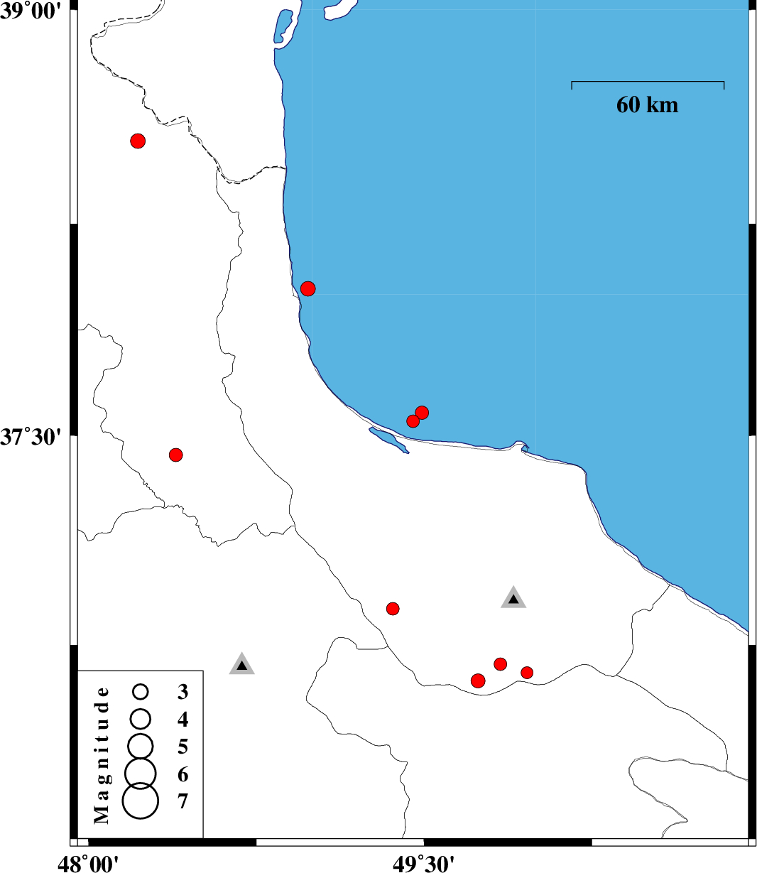 | 2013/01/29 | 10:51:41.7 | 14:21:41.7 | 37.58 | 49.49 | 14 | ML:2.7 | Caspian Sea, 12 km North of Bandar-e anzali | ||