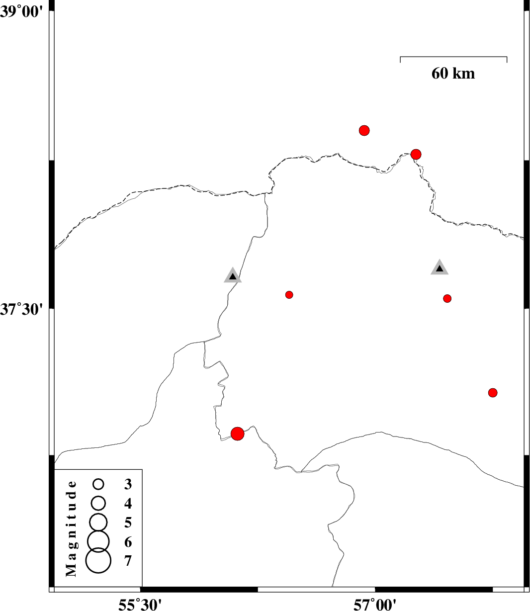 | 2013/02/01 | 20:05:44.3 | 23:35:44.3 | 37.55 | 57.46 | 35 | ML:2.3 | Khorasan(north) Province, 14 km East of Bojnurd | ||