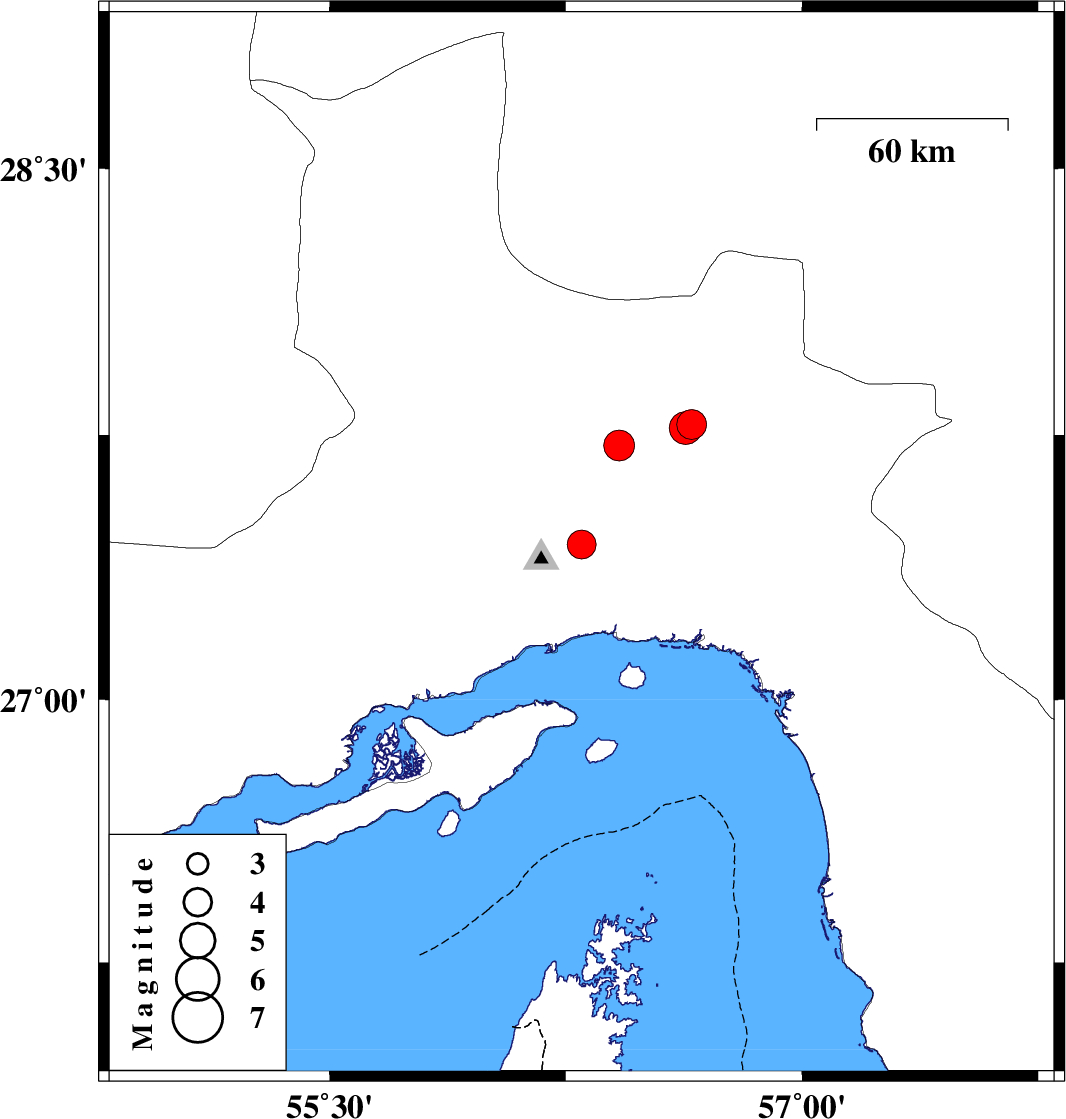 2013/02/07 | 13:42:09.1 | 17:12:09.1 | 27.44 | 56.3 | 15 | ML:4.1 | Hormozgan Province, 29 km North of Bandar-e abbas | ||