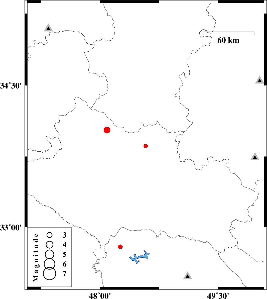 | 2013/02/04 | 05:31:57.5 | 09:01:57.5 | 34.03 | 48.09 | 15 | ML:3.6 | Lorestan Province, 12 km East of Nurabad | ||