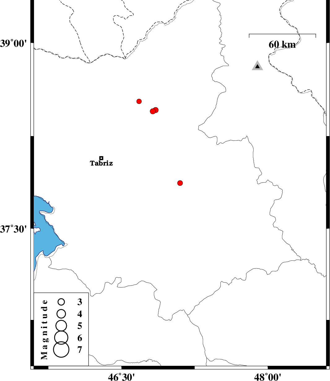 | 2013/02/08 | 19:25:57.1 | 22:55:57.1 | 37.87 | 47.1 | 14 | ML:2.4 | Azarbaijan Sharghi Province, 23 km East of Bostanabad | ||