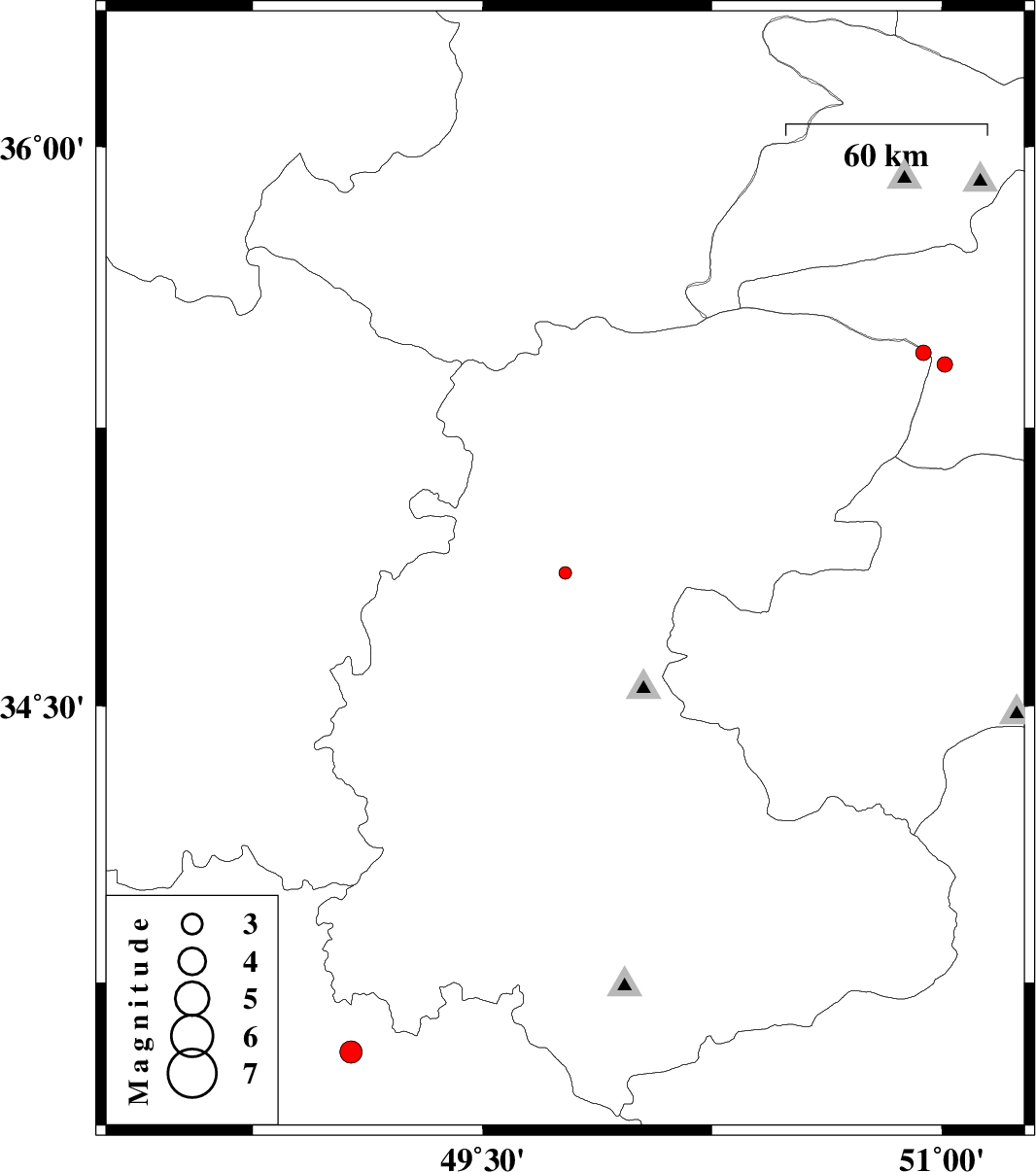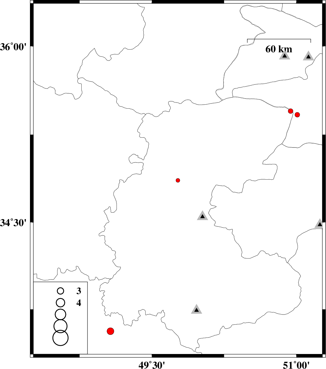 | 2013/01/16 | 15:19:41.8 | 18:49:41.8 | 33.56 | 49.07 | 16 | ML:3.3 | Lorestan Province, 9 km Dorud | ||