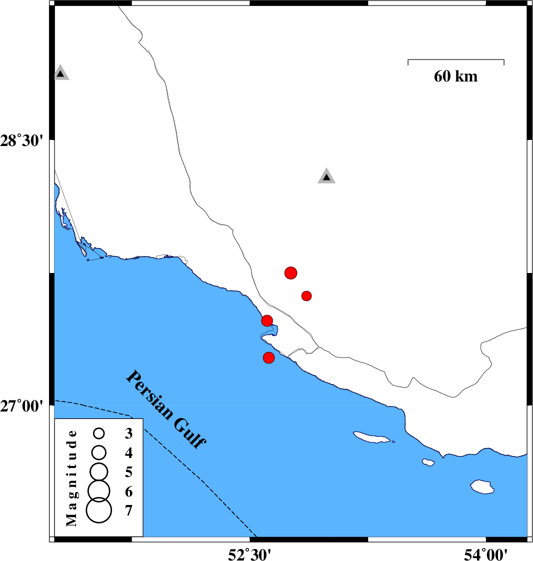 | 2013/01/22 | 12:25:52.7 | 15:55:52.7 | 27.48 | 52.61 | 14 | ML:3.3 | Bushehr Province, 29 km West of Mehr |
