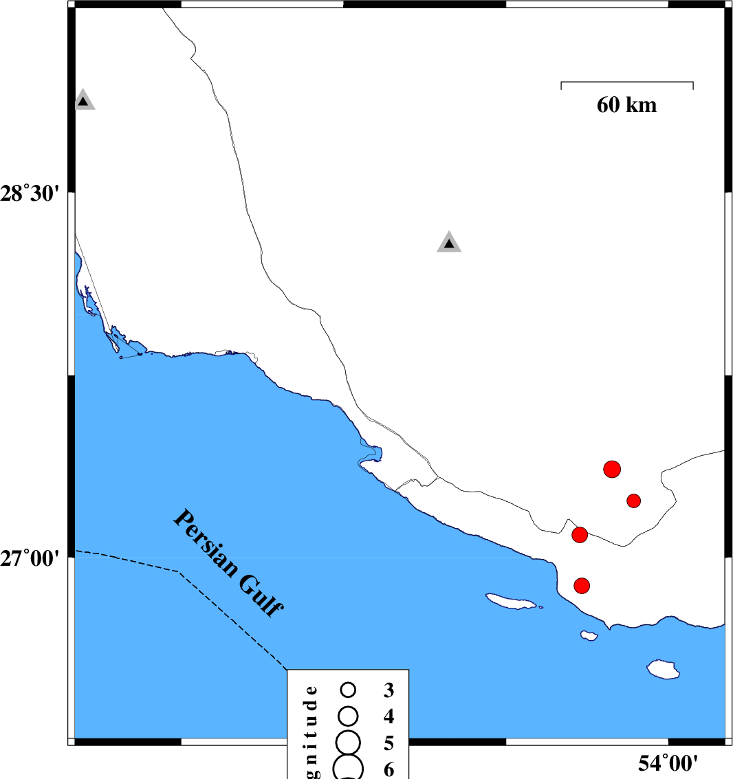 | 2013/02/09 | 19:23:50.7 | 22:53:50.7 | 27.27 | 52.62 | 14 | ML:3.2 | Persian Gulf, 41 km South-West of Mehr | ||