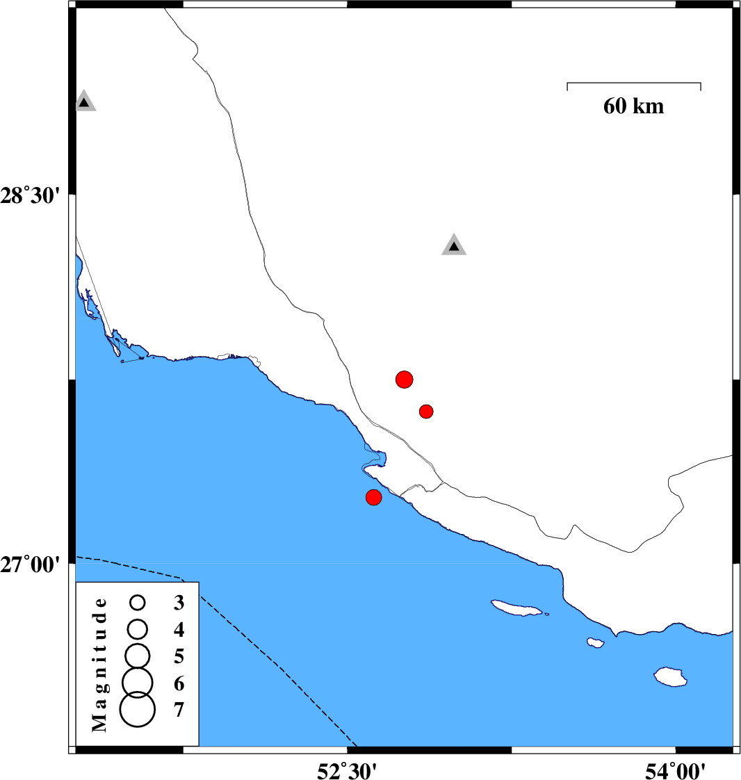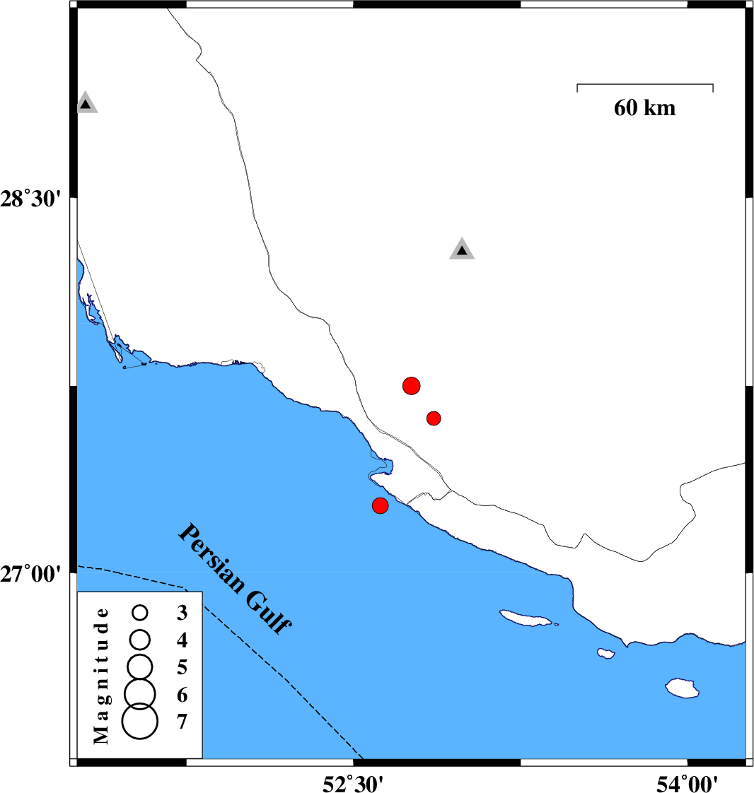 | 2013/02/09 | 19:23:50.7 | 22:53:50.7 | 27.27 | 52.62 | 14 | ML:3.2 | Persian Gulf, 41 km South-West of Mehr | ||