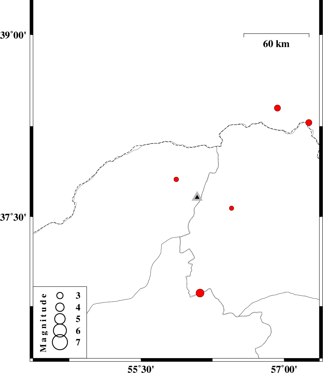 | 2013/02/06 | 20:21:53.1 | 23:51:53.1 | 37.57 | 56.45 | 35 | ML:2.1 | Khorasan(north) Province, 44 km West of Ashkhaneh | ||