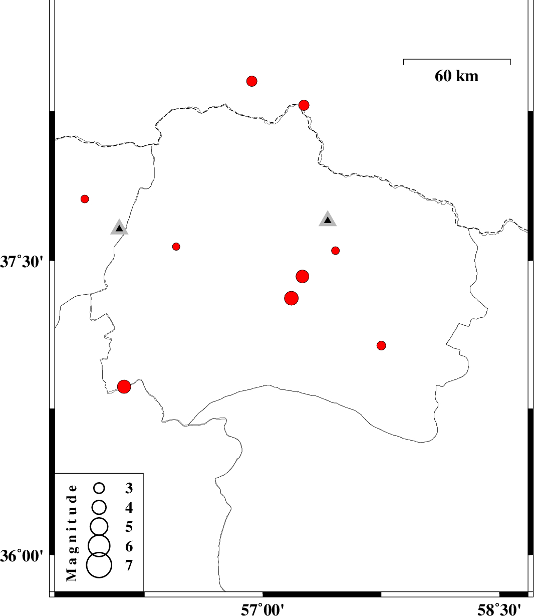 | 2013/02/12 | 12:26:58.1 | 15:56:58.1 | 37.31 | 57.18 | 25 | ML:3.9 | Khorasan(north) Province, 23 km South-West of Bojnurd | ||