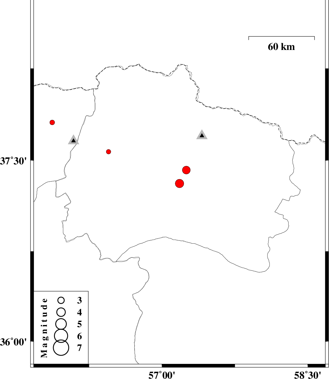 | 2013/02/12 | 12:26:58.1 | 15:56:58.1 | 37.31 | 57.18 | 25 | ML:3.9 | Khorasan(north) Province, 23 km South-West of Bojnurd | ||