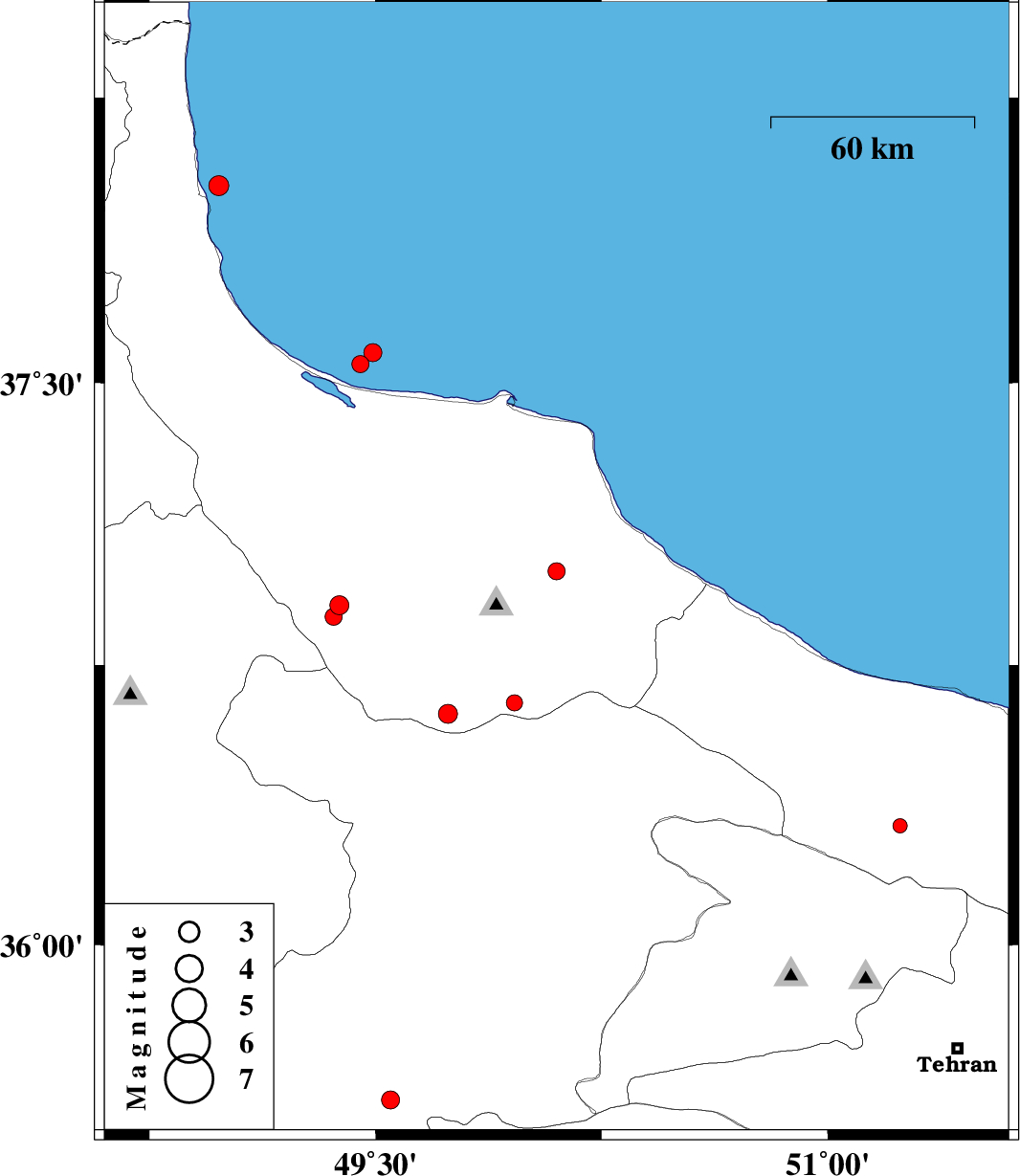 2013/01/29 | 10:51:41.7 | 14:21:41.7 | 37.58 | 49.49 | 14 | ML:2.7 | Caspian Sea, 12 km North of Bandar-e anzali | ||