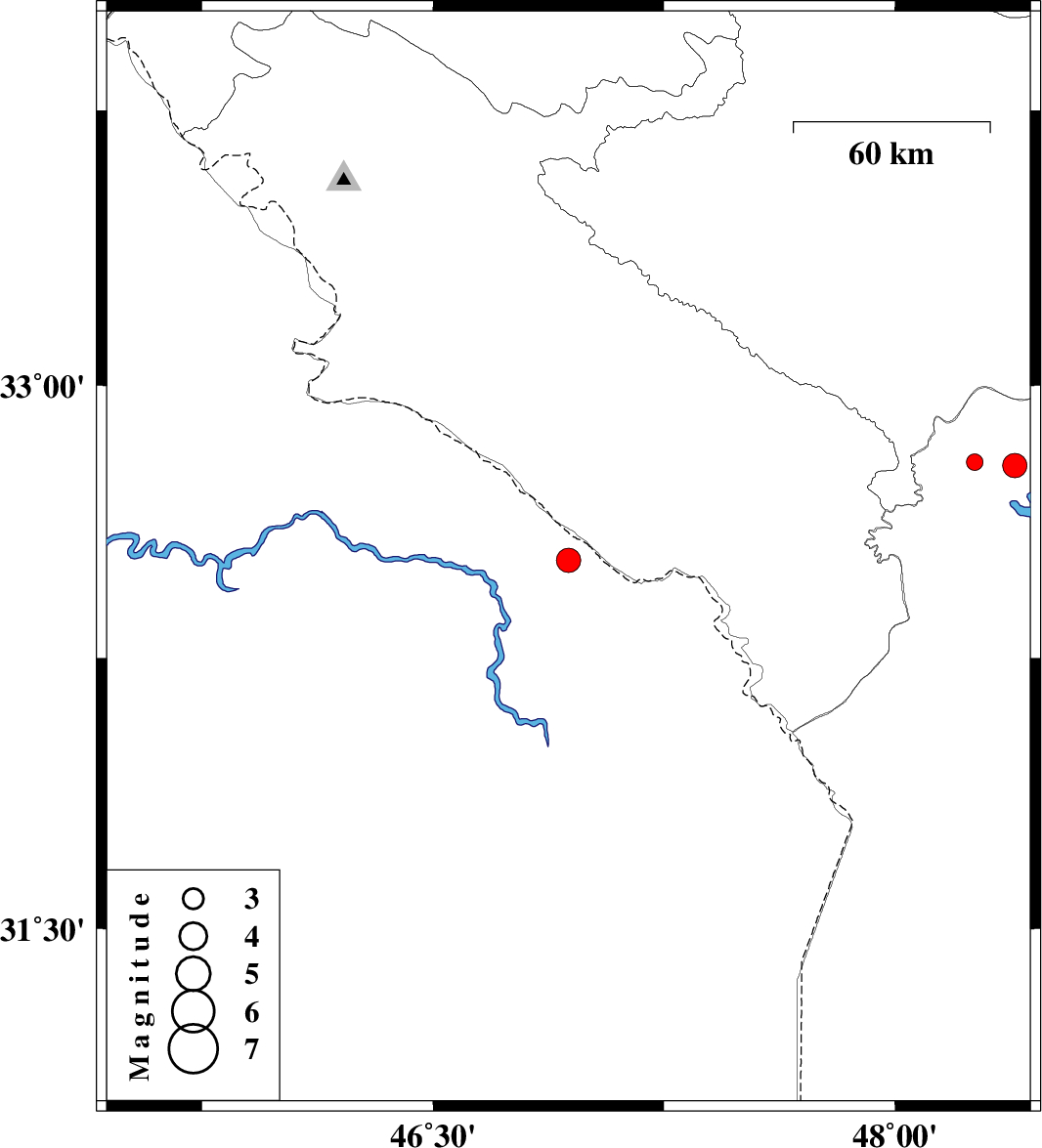 | 2013/02/14 | 05:23:24.5 | 08:53:24.5 | 32.52 | 46.94 | 14 | ML:3.5 | Iraq, 36 km South-West of Dehloran | ||