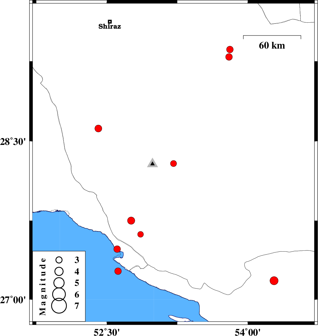 | 2013/02/09 | 19:23:50.7 | 22:53:50.7 | 27.27 | 52.62 | 14 | ML:3.2 | Persian Gulf, 41 km South-West of Mehr | ||