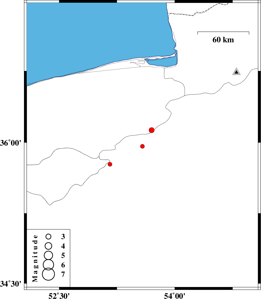 | 2013/02/15 | 23:42:43.8 | 03:12:43.8 | 35.96 | 53.58 | 15 | ML:2.4 | Semnan Province, 46 km North-East of Semnan | ||