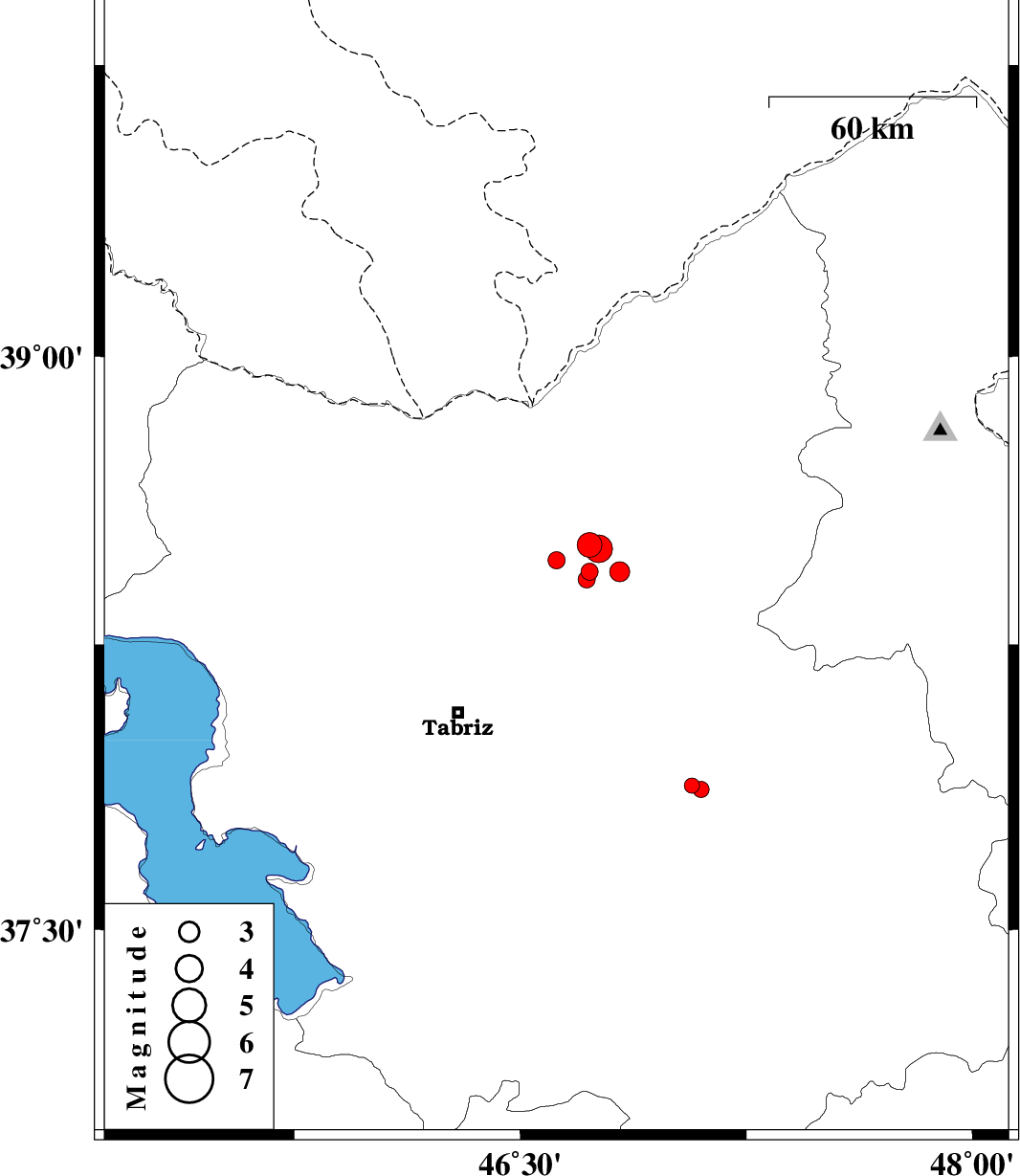 | 2013/02/11 | 01:49:50.1 | 05:19:50.1 | 38.44 | 46.83 | 14 | ML:2.9 | Azarbaijan Sharghi Province, 22 km West of Ahar | ||