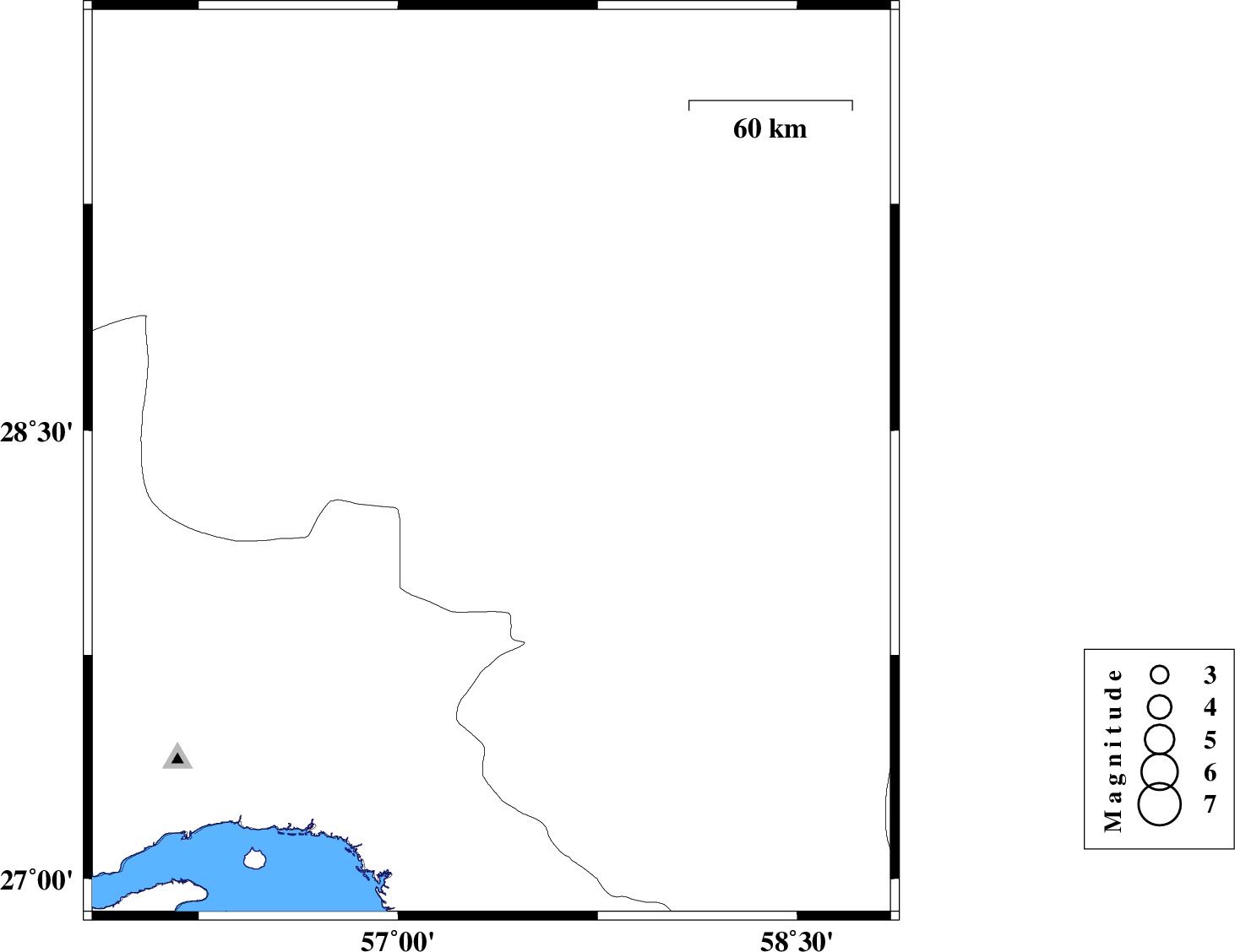 | 2013/02/16 | 13:09:05.1 | 16:39:05.1 | 28.39 | 57.35 | 14 | ML:4.1 | Kerman Province, 49 km South-West of Jiroft | ||