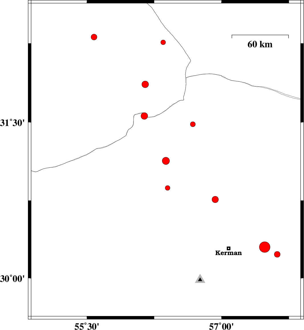 2013/02/10 | 01:56:27.8 | 05:26:27.8 | 30.23 | 57.62 | 18 | ML:2.9 | Kerman Province, 52 km East of Kerman | ||
