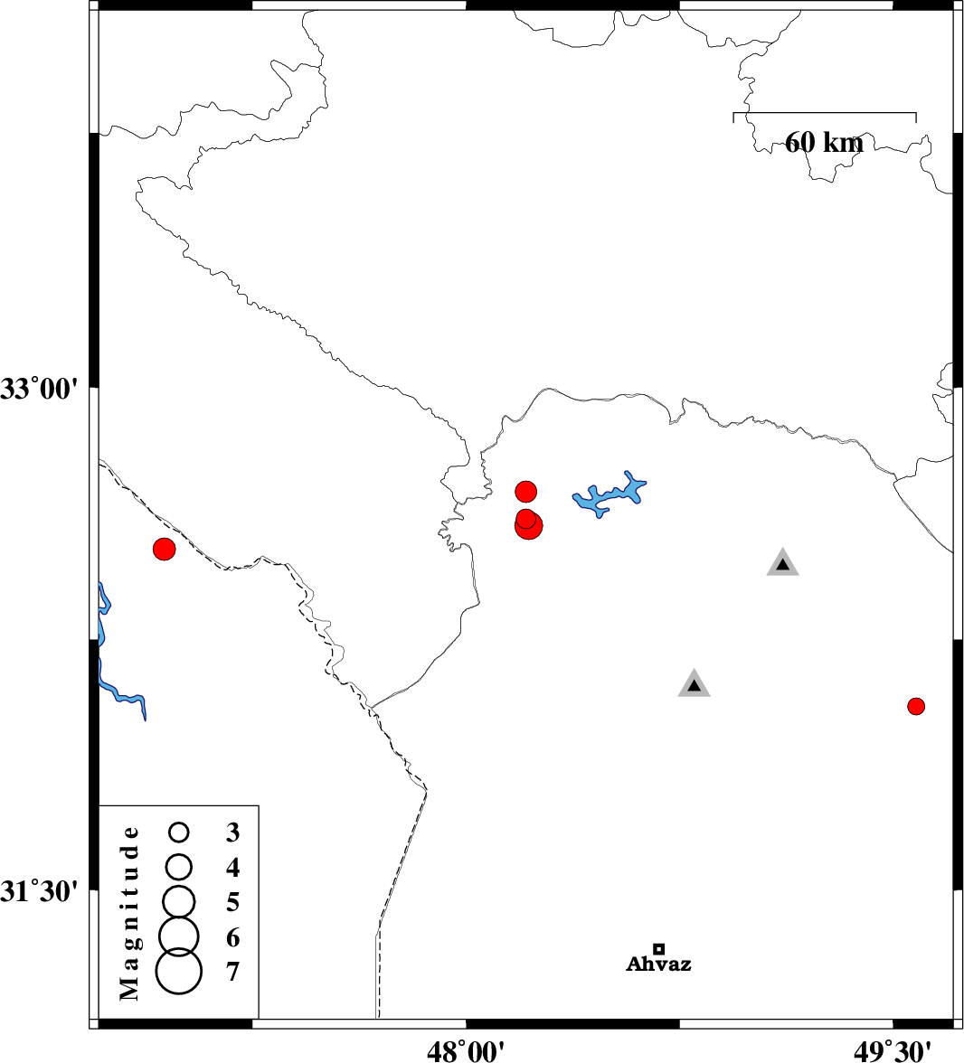 | 2013/02/19 | 04:55:48.5 | 08:25:48.5 | 32.59 | 48.22 | 16 | ML:4.4 | Khoozestan Province, 19 km North-West of Andimeshk | ||