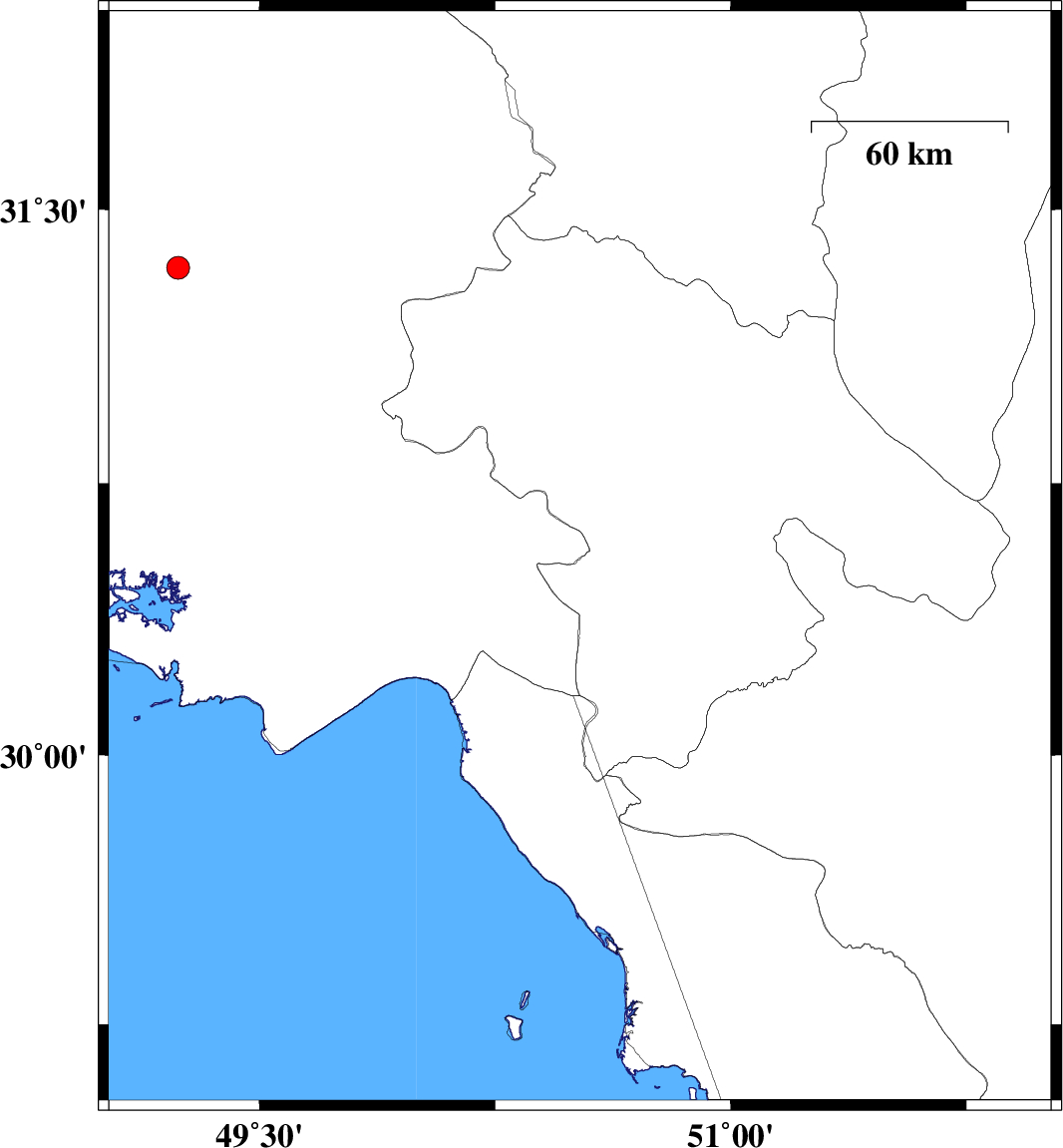 | 2013/02/19 | 11:07:40.3 | 14:37:40.3 | 30.54 | 50.52 | 14 | ML:3.3 | Khoozestan Province, 28 km South of Dehdasht | ||