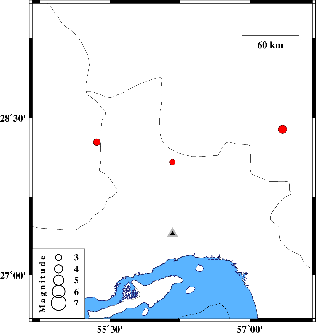 | 2013/02/16 | 13:09:05.1 | 16:39:05.1 | 28.39 | 57.35 | 14 | ML:4.1 | Kerman Province, 49 km South-West of Jiroft |