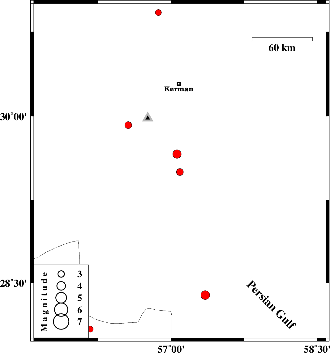 | 2013/02/16 | 13:09:05.1 | 16:39:05.1 | 28.39 | 57.35 | 14 | ML:4.1 | Kerman Province, 49 km South-West of Jiroft |