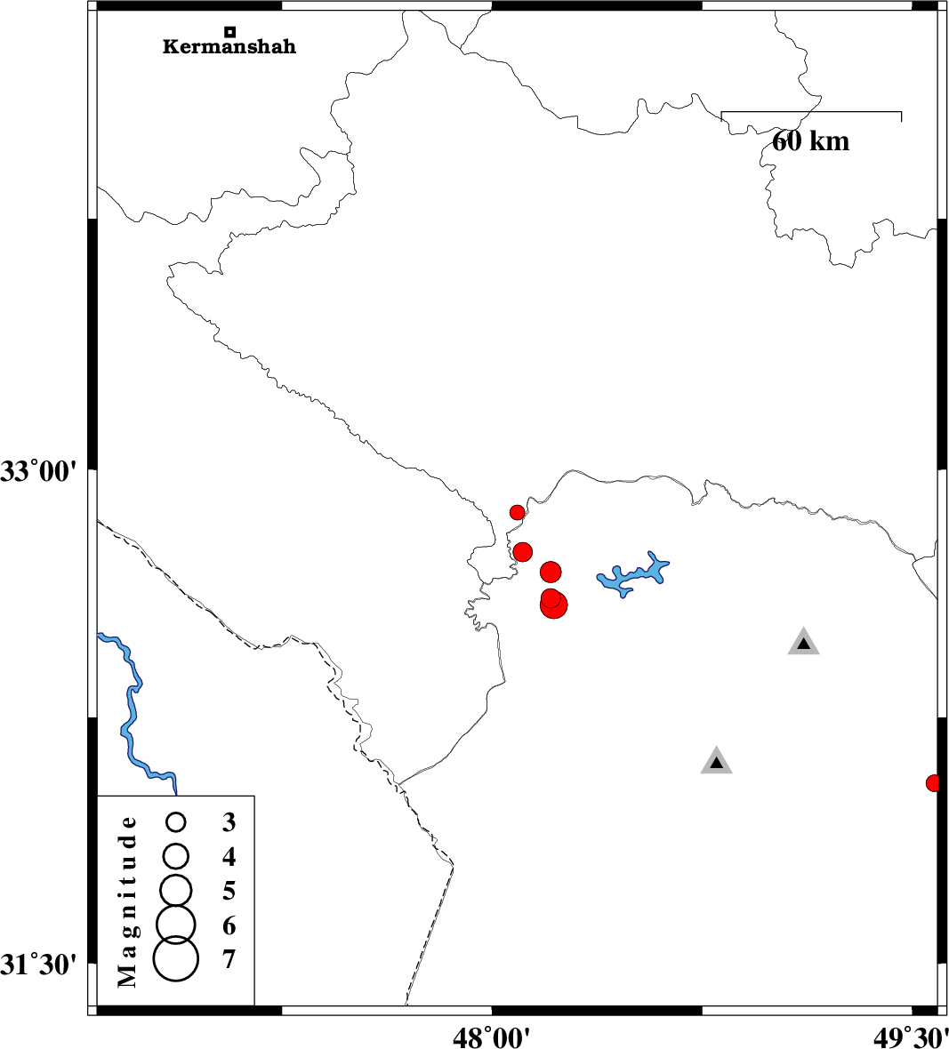| 2013/02/22 | 02:34:45.3 | 06:04:45.3 | 32.87 | 48.09 | 14 | ML:2.4 | Lorestan Province, 47 km South-East of Pol-e dokhtar | ||