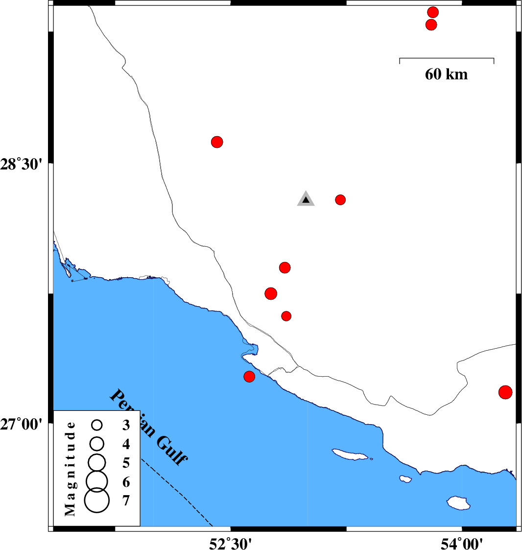 | 2013/02/15 | 10:04:31.5 | 13:34:31.5 | 28.62 | 52.41 | 6 | ML:3.4 | Fars Province, 30 km South-West of Firuz Abad | ||