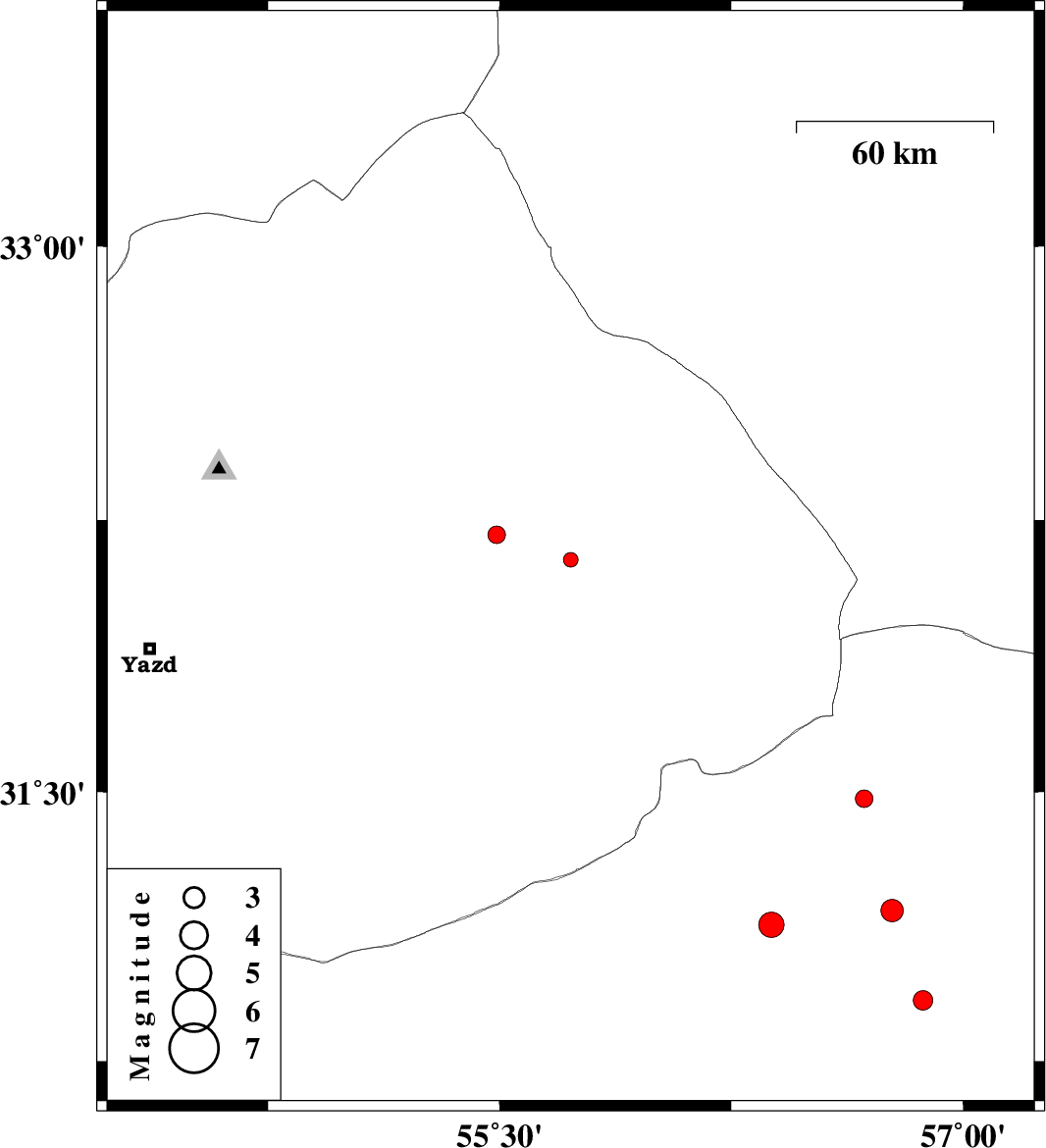 2013/02/19 | 00:03:50.5 | 03:33:50.5 | 30.92 | 56.87 | 14 | ML:2.8 | Kerman Province, 39 km South of Ravar | ||